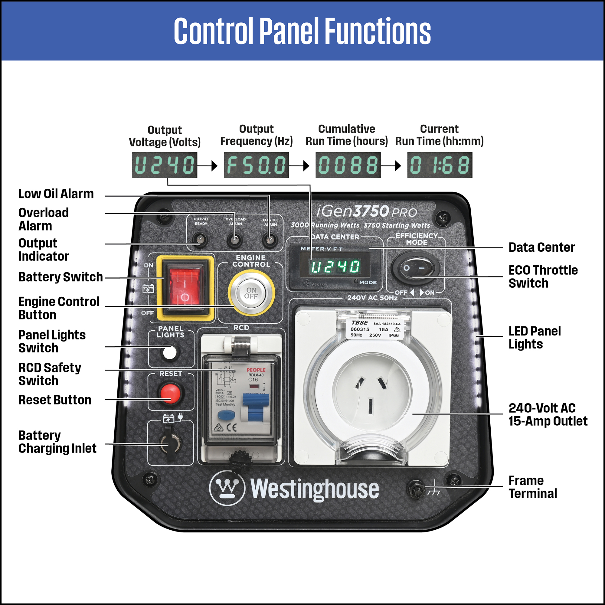 • LED lights illuminate control panel for use at night-time