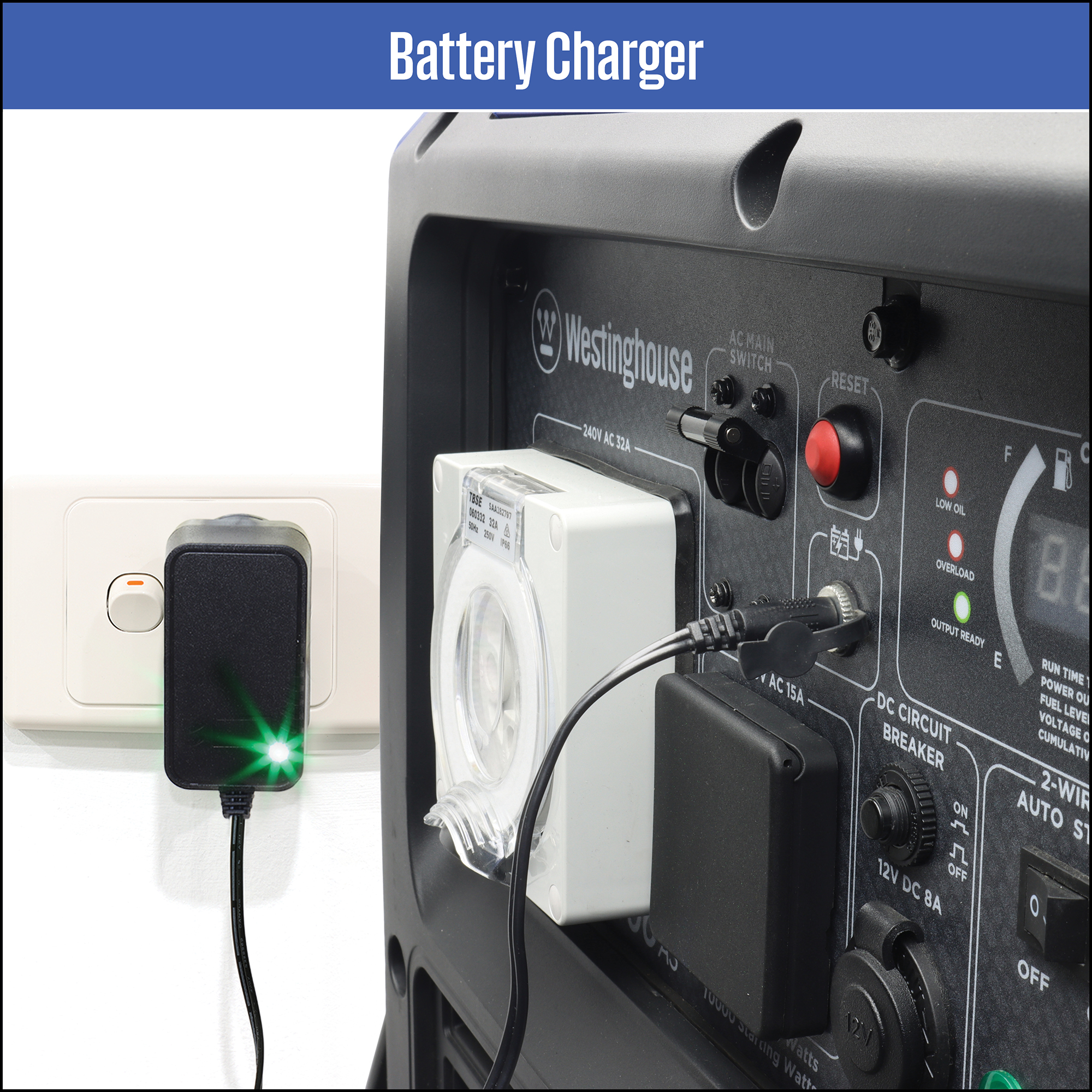 240 Volt AC plug-in charger to maintain onboard battery