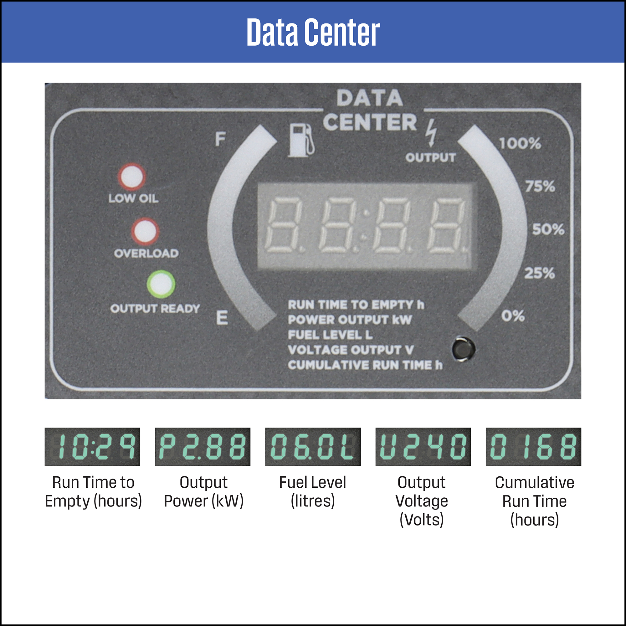 Up to 14.6 hrs run time at 1/4 load on a 15-litre tank of fuel